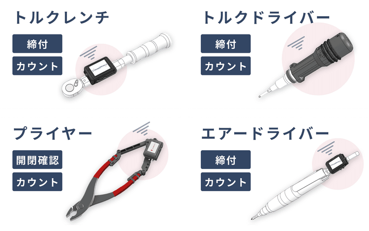 工具の買替が発生しないため、導入コストを抑えることができます。トルクドライバー、電動ドライバー、エアドライバー、トルクレンチ、デジタル測定器に対応、作業データを無線送信、記録できるため、ヒューマンエラー防止による品質向上、ダブルチェック代用による工数削減、作業ログ分析による工程改善が見込めます。