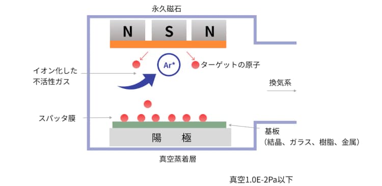 マグネトロンスパッタリング法 | マグネトロンスパッタリング法は、2極スパッタリング法の進化版であり、ターゲット表面に磁石を配置して磁界を印加する方法です。二次電子を捕捉して高密度のプラズマを発生させることができます。 高密度プラズマにより、成膜速度が大幅に向上し、効率的な成膜が可能となります。 |
