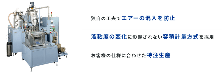 エアーの混入を完全に防ぐために、液経路の密閉保持の各部に独自のエ夫を施しています。また、計量ポンプには液粘度の変化に影響されない容積計量方式を採用しており、常に安定した高精度計量吐出が可能です。