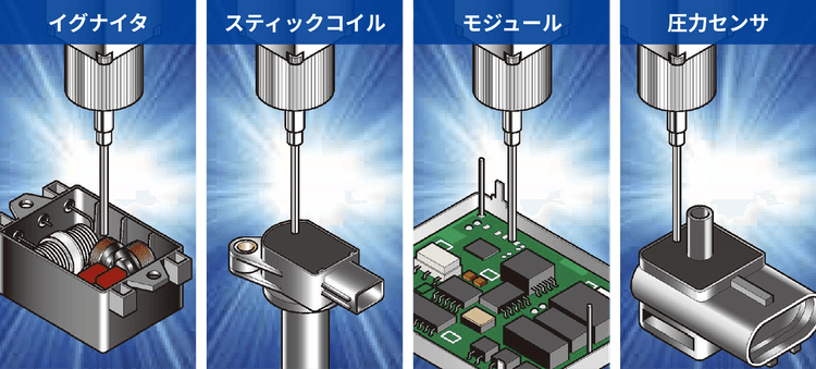 イグナイタ、スティックコイル、モジュール、圧力センサなど様々な部品製造に採用されています。