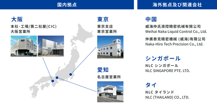 国内では大阪、東京、名古屋に営業拠点がございます。また、中国・シンガポール・タイの3カ国に海外拠点及び関連会社がございます。