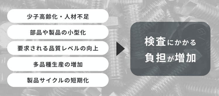 このような社会的問題に加え、近年のものづくり産業においては、部品や製品の小型化が進み、市場で要求される品質レベルも高くなっています。さらに、多様化するユーザーニーズに応えるべく、多品種生産の増加や製品サイクルの短期化といった傾向も背景に、検査にかかる製造現場の負担はさらに大きくなっており、検査工程は、生産プロセスにおけるボトルネックとなっているという声も多く聞かれます。