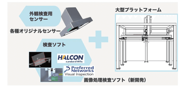 自社で開発したオリジナルモジュールのうち、標準タイプの可視化センサーと大型ロボットを組合せ、ルールベースの画像検査ソフトによる外観検査が可能なパッケージです。