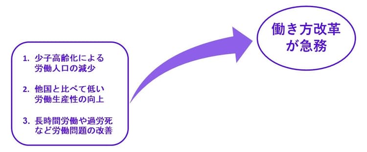 働き方改革とは、その名の通りこれまでの働き方の変革を目指す取り組みです。日本では、人口構成の変化やテクノロジーの発展、国際化による競争の激化などにより様々な問題が生まれています。