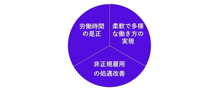2017年に発表された『働き方改革の実行計画』の中では、11の施策が提示されています。各施策は「労働時間の是正」「非正規雇用の処遇改善」「柔軟で多様な働き方の実現」の3つの柱のもとに成立しています。